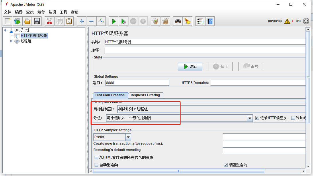 2、HTTP代理服务器设置:目标控制器:“测试计划-》线程组”;分组:“每个组放入一个新的控制器”