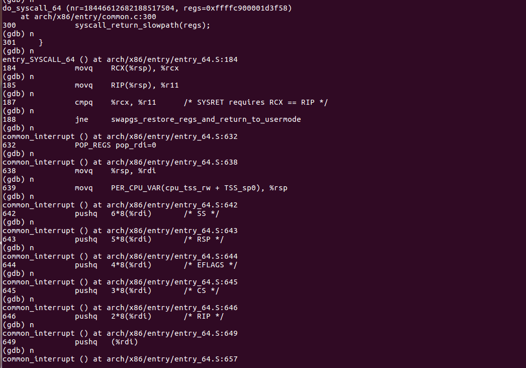 - 通过gdb跟踪该系统调用的内核处理过程重点阅读分析系统调用入口的保存现场、恢复现场和系统调用返回,以及重点关注系统调用过程中内核堆