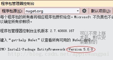 在这里安装EntityFramwork的时候我带上了版本号,因为EntityFramework5用的比较多,所以这里还是用老版本好了(2014年2月22日当前最新版本是6.0)。EntityFramework.dll在Nuget上的官网位置为: