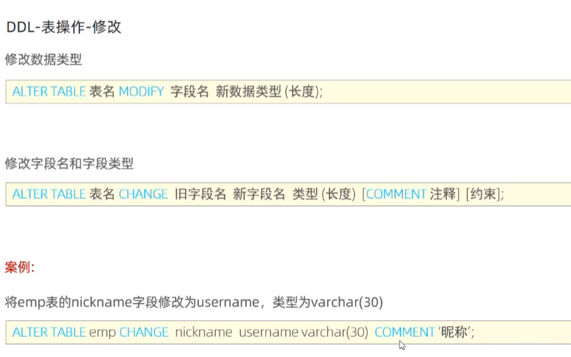 ALTER TABLE emp change nickname username VARCHAR(30); --修改字段nickname为username