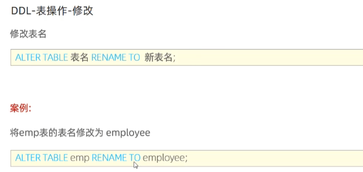 ALTER TABLE emp RENAME TO employee; -- 修改表名