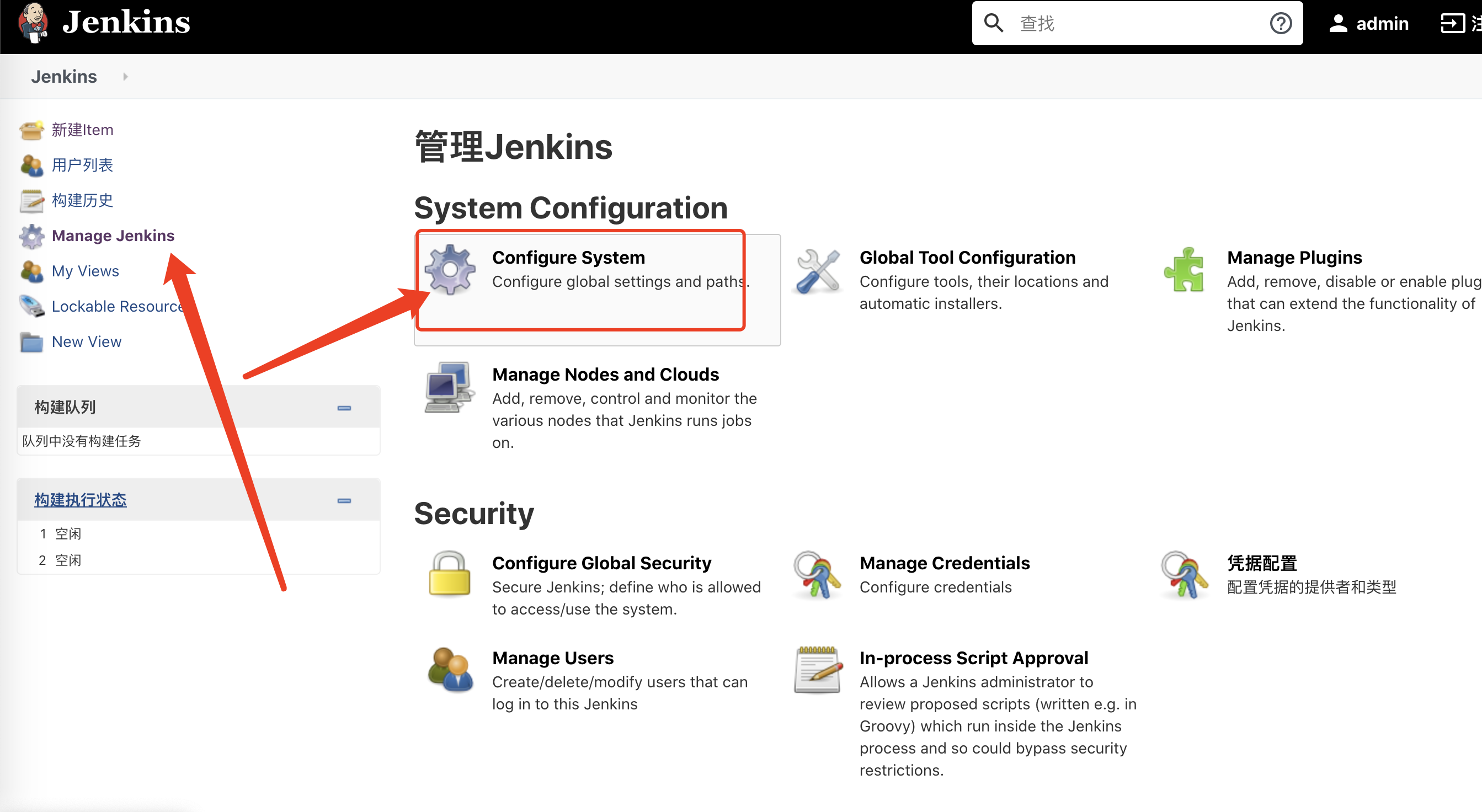 进入Jenkins,点击管理Jenkins,系统配置,进入系统配置页面;