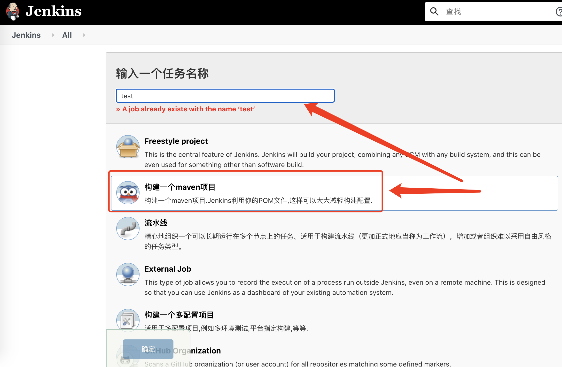 新建item,选择构建maven项目,并填写构建项目的名称。Jenkins服务器要提前安装好maven和git。