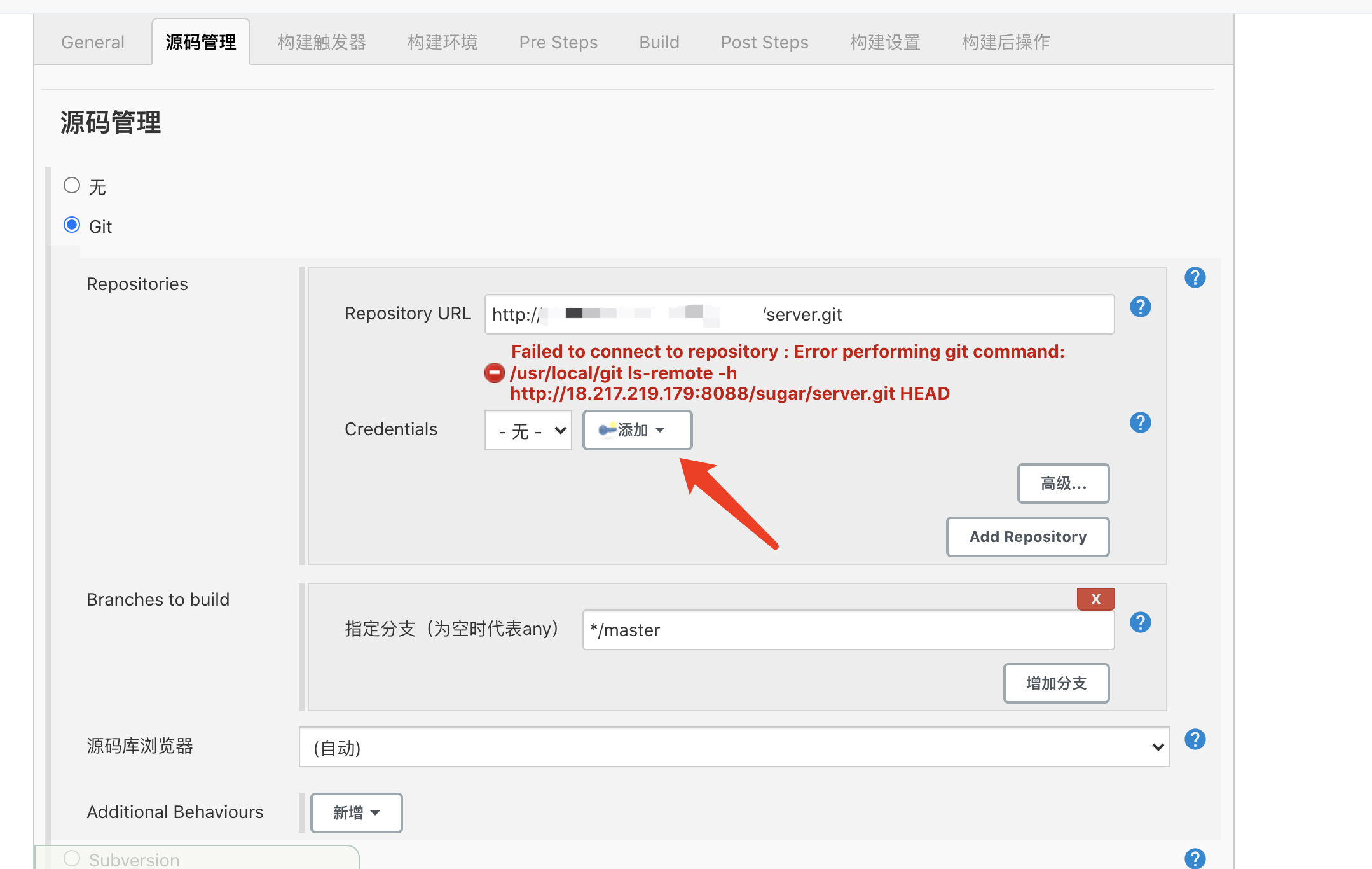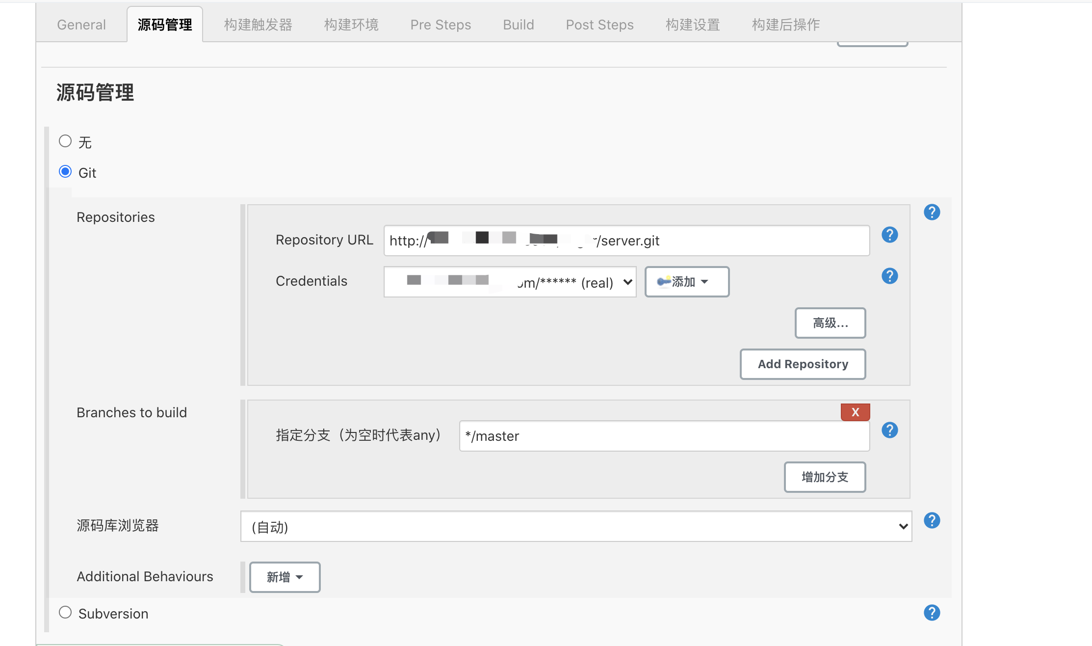 点击确定后,进入修改项目配置的页面,下拉到源码管理,填写源码拉取地址,并配置访问用户。