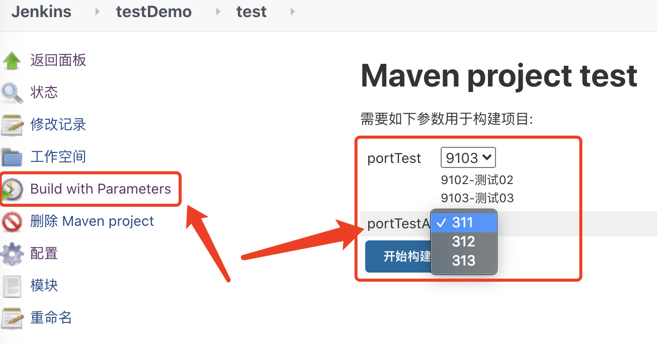 该参数可以通过maven打包传到项目中(-DportTest接收到数据后,会修改pom.xml中的<portTest></portTest>中,供项目使用),也可以在执行命令时动态使用。