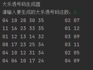 import random def number(): a=[random.randint(1,35) for i in range(5)] list1=[] for i in a: if i not in list1: list1.append(i) else: i=random.randint(1,35) list1.append(i) list1.sort() a=[str(i) for i in list1] b=[random.randint(1,12) for i in range(2)] o=[] for i in b: if i not in o: o.append(i) else: i=random.randint(1,12) o.append(i) o.sort() b=[str(i) for i in o] c=[" "*5] for i in range(5): if len(a[i])==2: for j in range(2): if len(b[j])==2: pass else: b[j]='0'+b[j] else: a[i]='0'+a[i] g=a+c+b for i in g: print(i,end=" ") print("大乐透号码生成器") k=int(input("请输入要生成的大乐透号码注数:")) for i in range(k): number() print("")