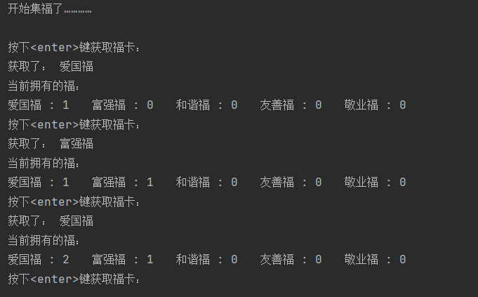 最近两年流行春节集五福活动。现编程实现模拟春节集五福的过程。效果如图8.19所示。