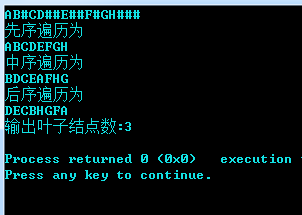 #include <stdio.h> #include <iostream> #include <algorithm> using namespace std; typedef struct BiTNode { char data; struct BiTNode *l; struct BiTNode *r; } BiTNode,*BiTree; void CreatBiTree(BiTree &T) { ///按先序次序输入二叉树中结点的值(一个字符),创建二叉链表表示的二叉树T; char ch; scanf("%c",&ch); if(ch=='#') T=NULL; else { T=new BiTNode; T->data=ch; CreatBiTree(T->l); CreatBiTree(T->r); } } void PreOrderTraverse(BiTree T)///先序遍历二叉树 { if(T) { printf("%c",T->data); PreOrderTraverse(T->l); PreOrderTraverse(T->r); } } void MidOrderTraverse(BiTree T)///中序遍历二叉树 { if(T) { MidOrderTraverse(T->l); printf("%c",T->data); MidOrderTraverse(T->r); } } void AfOrderTraverse(BiTree T)///后序遍历二叉树 { if(T) { AfOrderTraverse(T->l); AfOrderTraverse(T->r); printf("%c",T->data); } } int Count(BiTree T){ //计算叶子结点的数目(利用递归) if(T== NULL){ return 0; } else if ((T->l==NULL) && (T->r==NULL)){ return 1; } else{ return Count(T->l)+Count(T->r); } } int main() { BiTree T; CreatBiTree(T); printf("先序遍历为\n"); PreOrderTraverse(T); printf("\n"); printf("中序遍历为\n"); MidOrderTraverse(T); printf("\n"); printf("后序遍历为\n"); AfOrderTraverse(T); printf("\n"); printf("输出叶子结点数:%d\n",Count(T)); return 0; }