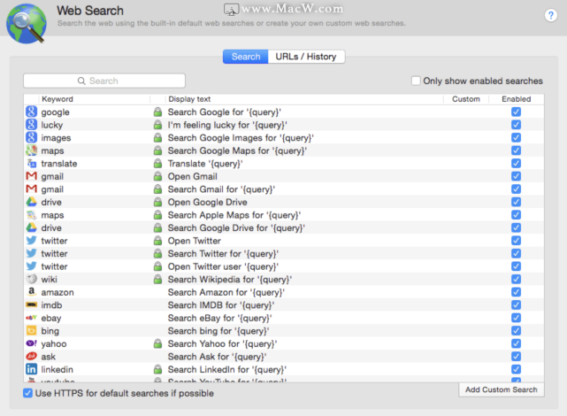 我们提供了广泛的流行网络搜索 - 谷歌、维基百科、地图等等 - 以帮助您快速找到所需内容。要查看默认网络搜索及其各自关键字的完整列表,请查看 Alfred 的功能 > 网络搜索首选项。