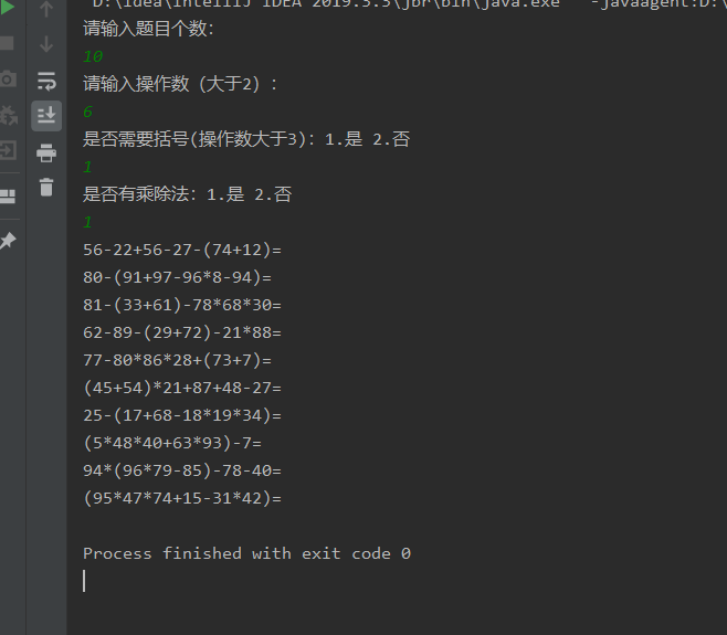 import java.lang.reflect.Array; import java.util.Random; import java.util.Scanner; //先输入需要多少操作数,然后开始生成随机数,一个随机数一个运算符,加计数器,直到运算数的数目达到要求,运用字符串的常用函数,把新生成的加入到之前的后面 ,最后是输出字符串,未完成目前 //避免重复是存储字符串,存储然后用equals对比 //随机生成括号,创建随机数在输出某个操作数之后,随机生成括号位置,左括号通过使得随机数在最后一个操作数减去2之前生成,右括号要求至少在左括号之后的一个操作数之后输出。 //控制乘除法可以通过控制随机数1.2之间 public class sizeyunsuan { public static void main(String[] args) {int c; System.out.println("请输入题目个数:"); Scanner c1 = new Scanner(System.in); c = c1.nextInt(); int a; System.out.println("请输入操作数(大于2):"); Scanner a1 = new Scanner(System.in); a = a1.nextInt(); int x, y; System.out.println("是否需要括号(操作数大于3):1.是 2.否"); Scanner x1 = new Scanner(System.in); x = x1.nextInt(); System.out.println("是否有乘除法:1.是 2.否"); Scanner y1 = new Scanner(System.in); y = y1.nextInt(); if (x == 2 && y == 1) { for (int j = 0; j < c; j++) { for (int i = 0; i < a - 1; i++) { Random r1 = new Random(); int i1 = r1.nextInt(99) + 1; Random r2 = new Random(); int i2 = r2.nextInt(3) + 1; char fuhao = '0'; if (i2 == 1) { fuhao = '+'; } else if (i2 == 2) { fuhao = '-'; } else if (i2 == 3) { fuhao = '*'; } else if (i2 == 4) { fuhao = '/'; } System.out.print(i1); System.out.print(fuhao); } Random r1 = new Random(); int i1 = r1.nextInt(99) + 1; System.out.println(i1 + "="); } } else if (x == 2 && y == 2) { for (int j = 0; j < c; j++) { for (int i = 0; i < a - 1; i++) { Random r1 = new Random(); int i1 = r1.nextInt(99) + 1; Random r2 = new Random(); int i2 = r2.nextInt(1) + 1; char fuhao = '0'; if (i2 == 1) { fuhao = '+'; } else if (i2 == 2) { fuhao = '-'; } System.out.print(i1); System.out.print(fuhao); } Random r1 = new Random(); int i1 = r1.nextInt(99) + 1; System.out.println(i1 + "="); } } else if (x == 1 && y == 1) { for (int j = 0; j < c; j++) { int flag=0; Random r3 = new Random();//r3表示左括号的生成位置 int i3 = r3.nextInt(a-1);//0到a-1个位置 Random r4 = new Random();//r4右括号的位置 int i4 = r4.nextInt(a) %(a-i3)+i3+1; for (int i = 0; i < a - 1; i++) { Random r1 = new Random(); int i1 = r1.nextInt(99) + 1; Random r2 = new Random(); int i2 = r2.nextInt(3) + 1; char fuhao = '0'; if (i2 == 1) { fuhao = '+'; } else if (i2 == 2) { fuhao = '-'; } else if (i2 == 3) { fuhao = '*'; } else if (i2 == 4) { fuhao = '/'; } if(i==i3){ System.out.print("("); } System.out.print(i1); if(i==i4){ System.out.print(")"); flag=1; } System.out.print(fuhao); } Random r1 = new Random(); int i1 = r1.nextInt(99) + 1; if(flag==0){ System.out.println(i1 + ")="); } else{System.out.println(i1 + "=");} } }else if (x == 1 && y == 1) { for (int j = 0; j < c; j++) { int flag=0; Random r3 = new Random();//r3表示左括号的生成位置 int i3 = r3.nextInt(a-1);//0到a-1个位置 Random r4 = new Random();//r4右括号的位置 int i4 = r4.nextInt(a) %(a-i3)+i3+1; for (int i = 0; i < a - 1; i++) { Random r1 = new Random(); int i1 = r1.nextInt(99) + 1; Random r2 = new Random(); int i2 = r2.nextInt(1) + 1; char fuhao = '0'; if (i2 == 1) { fuhao = '+'; } else if (i2 == 2) { fuhao = '-'; } if(i==i3){ System.out.print("("); } System.out.print(i1); if(i==i4){ System.out.print(")"); flag=1; } System.out.print(fuhao); } Random r1 = new Random(); int i1 = r1.nextInt(99) + 1; if(flag==0){ System.out.println(i1 + ")="); } else{System.out.println(i1 + "=");} } } } }