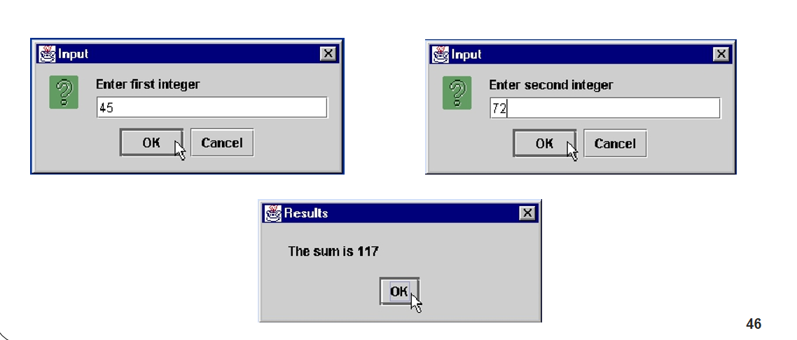 JOptionPane.showInputDialog( "Enter first integer" );