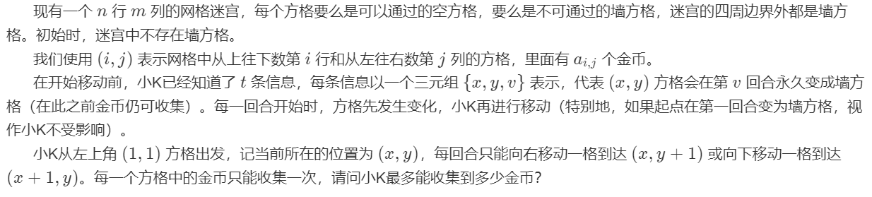因为在收集金币时,必须从已经走过的路径上转移,所以需要保证 \(dp_{i-1,j},dp_{i,j-1}\) 都不为 \(0\)