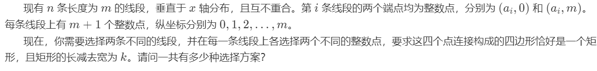 \[\sum_{i=1}^{n}\sum_{j=i+1}^{n}(m-h+1)=\sum_{i=1}^{n}\sum_{j=i+1}^{n}(m-(a_j-a_i-k)+1) \]此外还需要保证