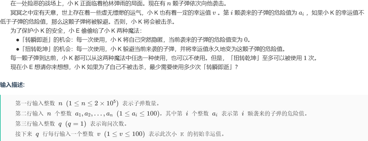 因为只有一次扭转乾坤的机会,所以对于每个射来的子弹,如果对这颗子弹使用扭转乾坤,那么转瞬即逝的使用次数取决于这个子弹之前危险值大于初始运气值的数量,加上这个子弹之后危险值大于这颗子弹的危险值的数量