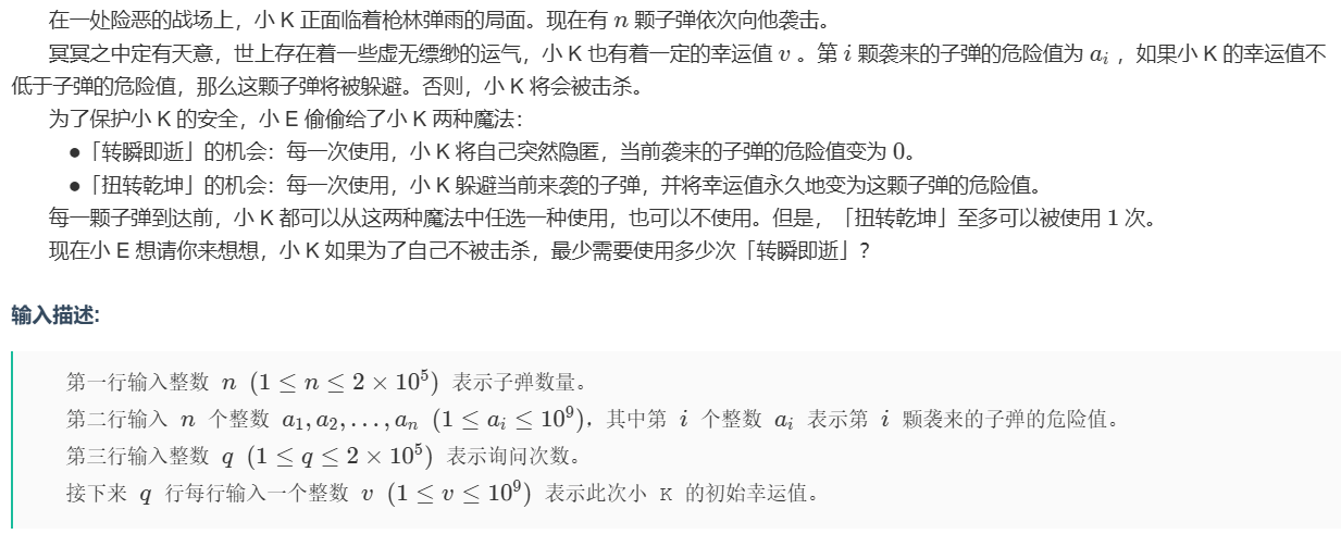 现在还需要计算在可考虑子弹前,大于运气值的子弹个数,由于数据量大,所以需要对询问进行离散化处理