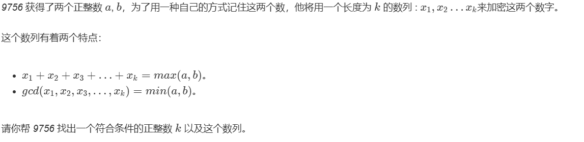 构造题,因为需要满足 \(gcd(x_1,x_2,\cdots,x_k)=min(a,b)\) ,假定 \(a>b\) ,那么所有的 \(x_i\) 都应该为 \(b\) 的整倍数