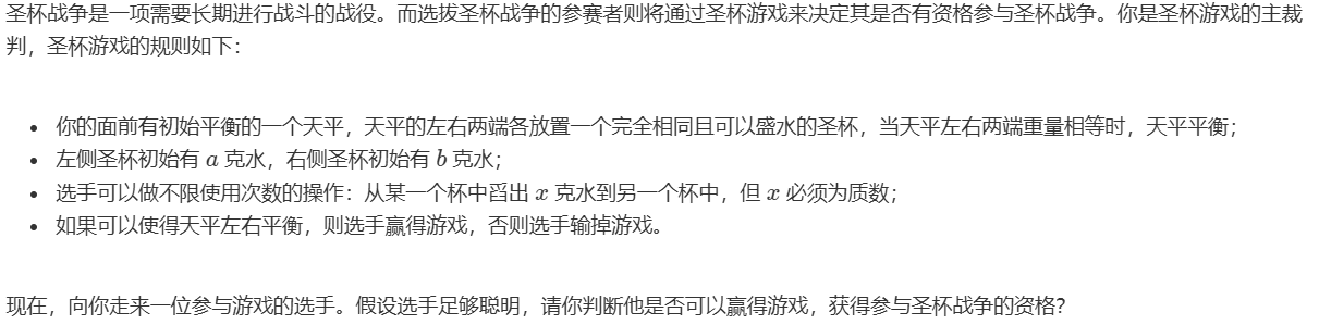然后根据唯一分解定理,任意一个大于 \(1\) 的数都能被表示为若干个质因子的乘积,设 \(x=\lvert a-(a+b)/2\rvert\) 表示能使天平平衡的需要转移的水的质量,当 \(x>1\) 时,显然有解、当 \(x=1\) 即 \((a,b)=(0,2)\) 时,无解