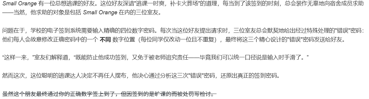 签到题,如果一位密码 \(c\) 有两个人以上相同,那么这一位密码就是 \(c\)