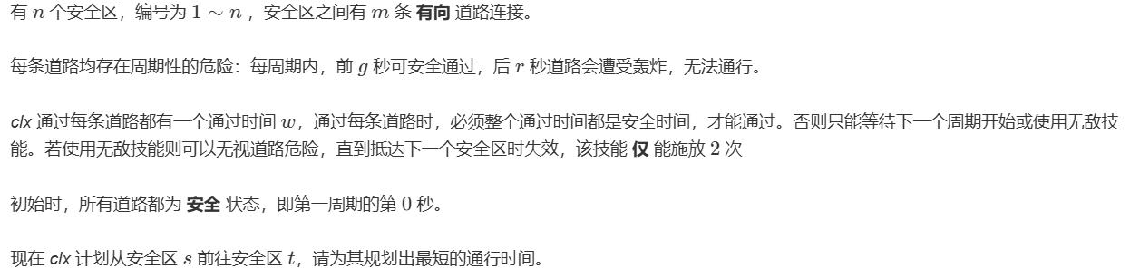 dis[it.v][t.cnt]=dis[t.now][t.cnt]+it.w+(it.g+it.r-t.tim%(it.g+it.r));