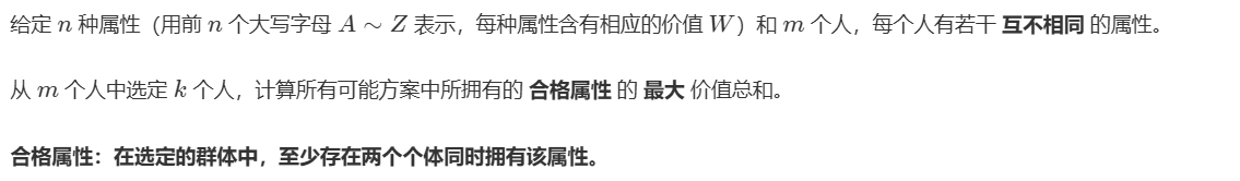 DFS 选出来的人的组合,过程中用 map 记录每种属性的个数,要开 long long 防止越界