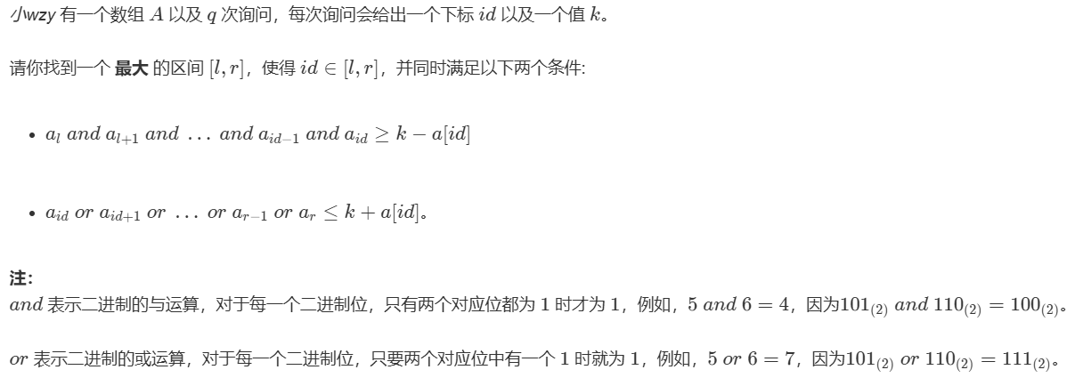不难发现对连续区间 \([l,r]\) 中元素进行 \(and,or\) 操作的单调性,所以可以通过两次二分计算左右区间延伸的长度
