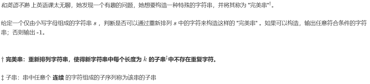贪心构造,考虑特殊情况,\(k=1\) 或者 \(k\) 大于 \(s\) 的长度时,显然无解
