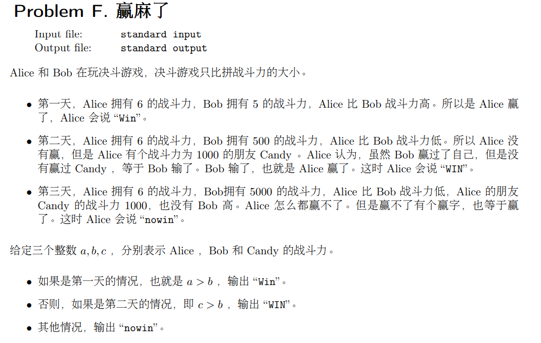 else if (c>b) cout<<"WIN"<<endl;