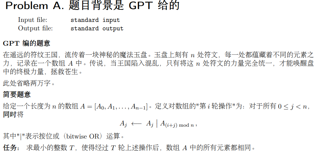 \(a_{i,j}\) 表示 \(a_i\) 用二进制表示下的第 \(j\) 位,当 \(a_{i,j}\) 为 \(1\) 时,第 \(T\) 轮 \(a_{(i+T)\%n,j}\) 被传播到 \(1\)