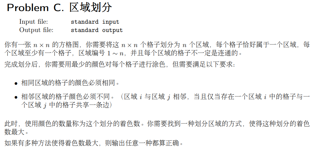 构造题,为了使着色数最大,且相邻的不同区域的格子颜色不同