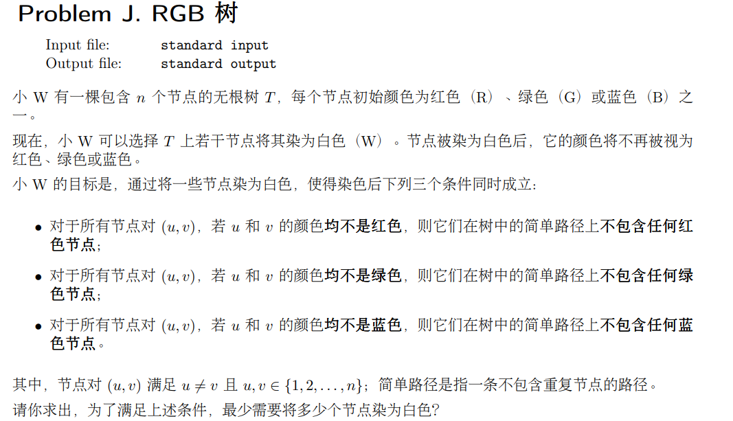 考虑对一种颜色,例如所有节点对 \((u,v)\) ,若 \(u,v\) 颜色均不为 \(R\) ,则两节点简单路径上也不存在 \(R\) 节点