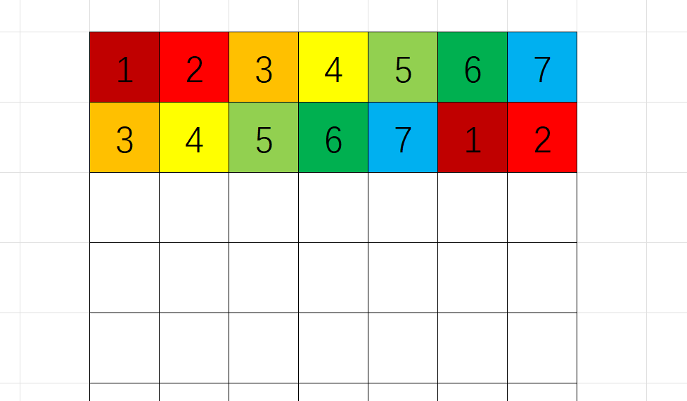先构造第一行,从 \(1\) 开始依次排开,为了使所有的区域与其他区域都相邻,那么第二行的 \((2,i)\) 与 \((1,i)\) 要在第一行没有相邻