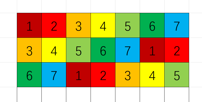 所以让 \(3\) 在 \(1\) 的下方,这样构造出来当前相邻数最优方案,同理有第三行