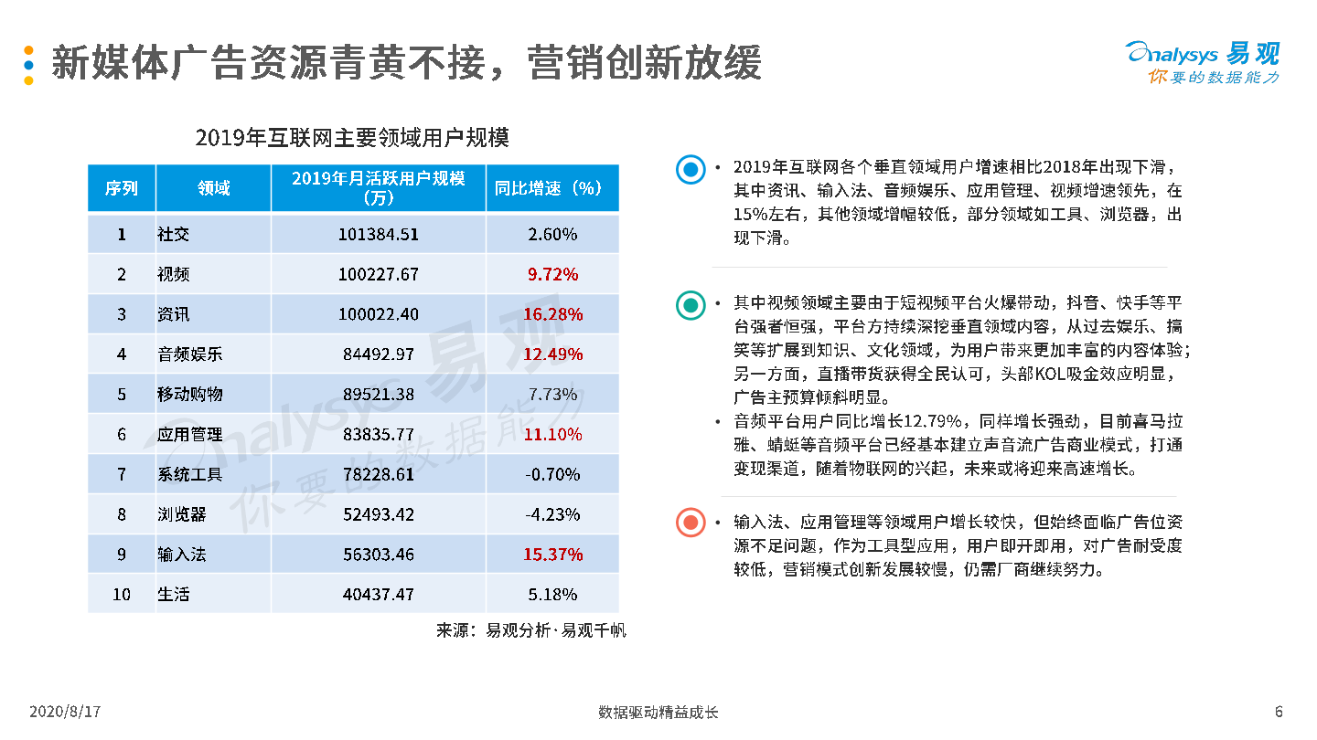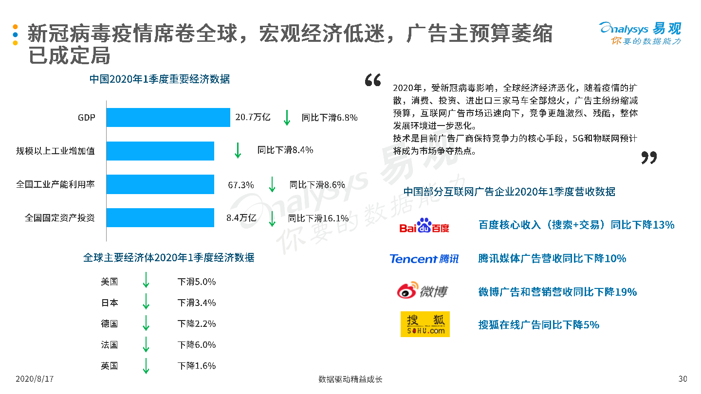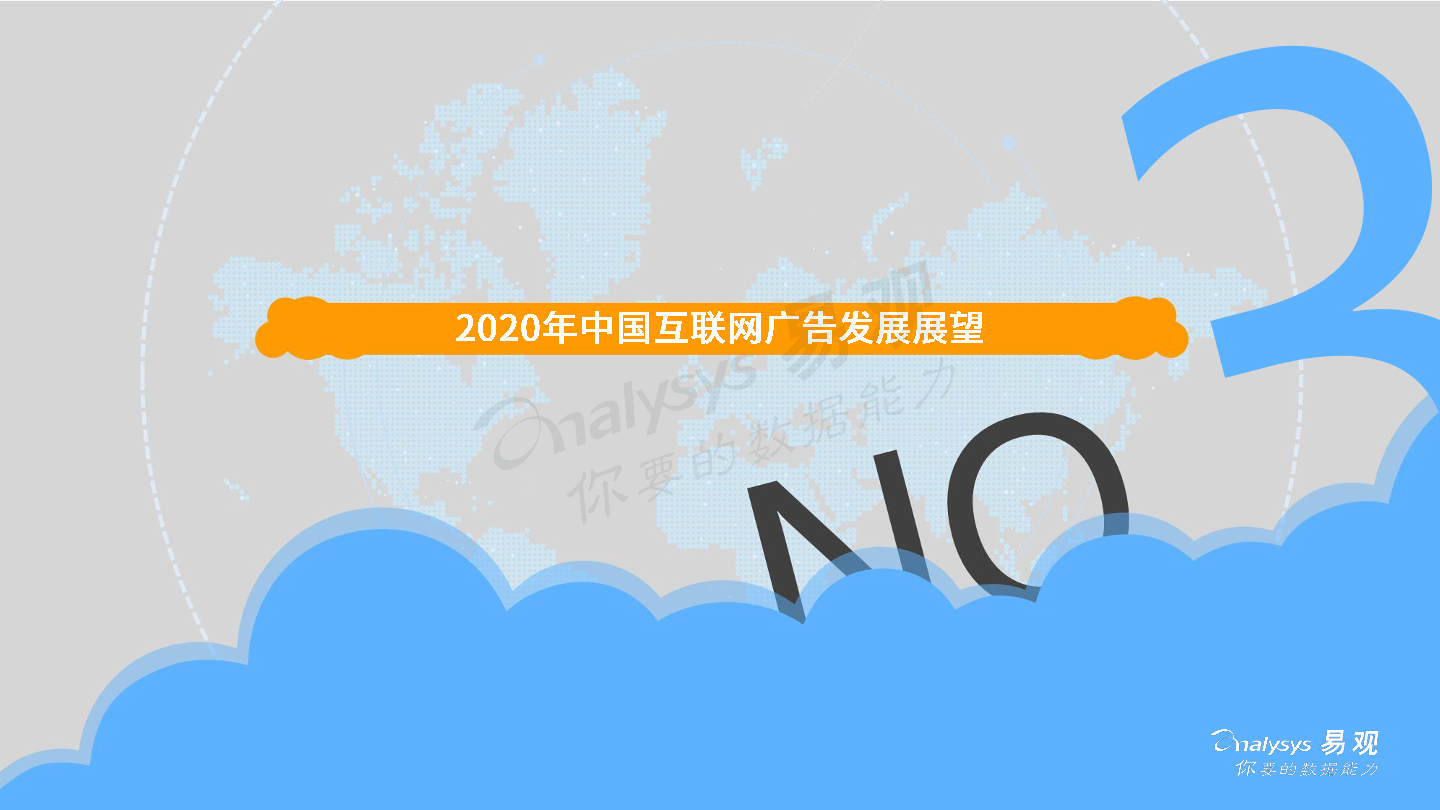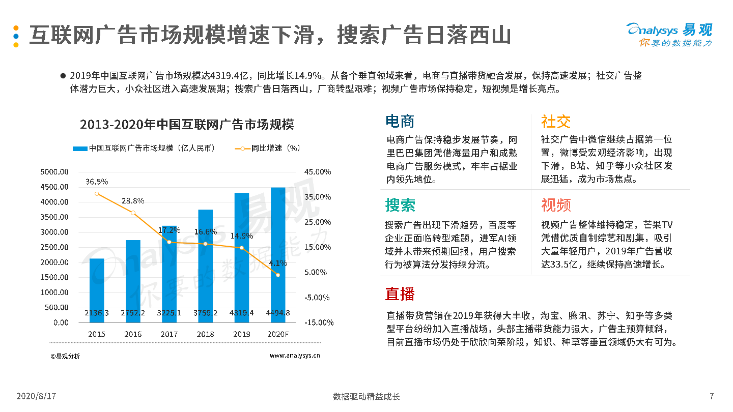 2020年8月17日,易观发布了《中国互联网广告市场年报2020》的分析报告。2019年受宏观经济低迷和互联网用户增长放缓影响,中国互联网广告市场整体发展环境趋于恶化,厂商间竞争激烈,但市场在危机中蕴含生机,B站、知乎等新兴流量平台开始破圈,吸引广告主注意力和预算倾斜;2020年整体市场受新冠疫情影响严重,未来疫情与生产、生活长期共存局面渐成共识,厂商需要积极开拓新兴媒体资源,创新营销模式,谋求长远发展。