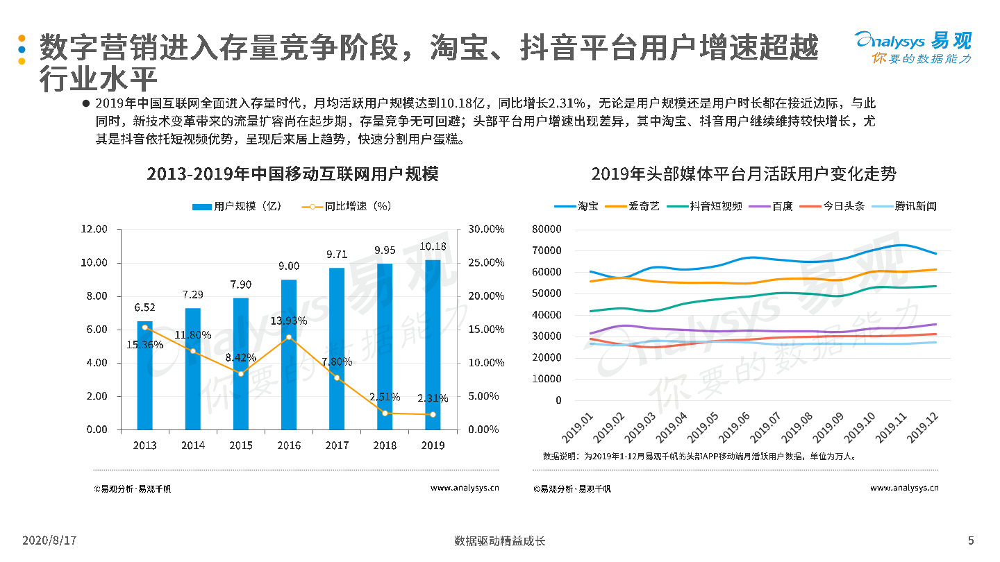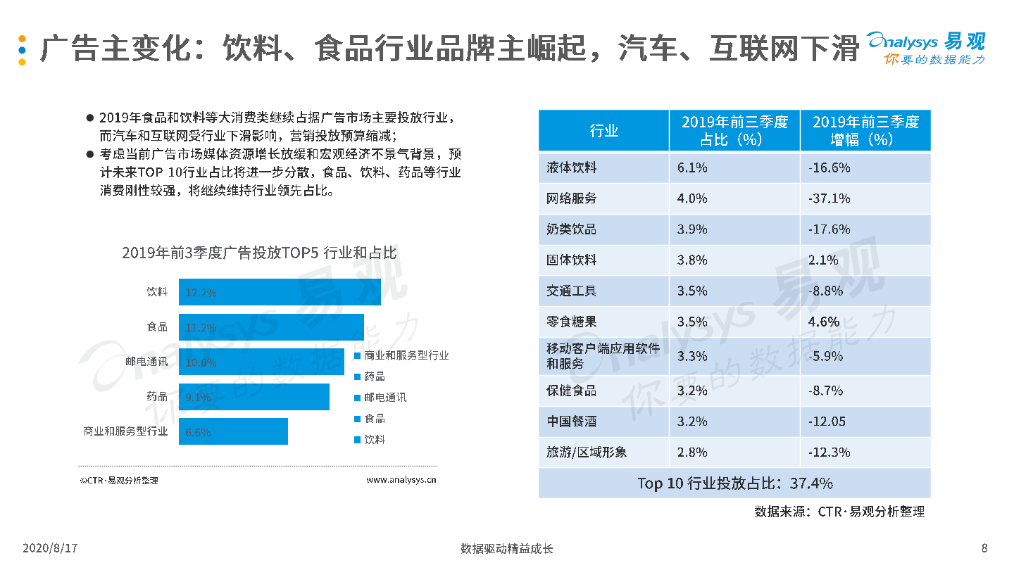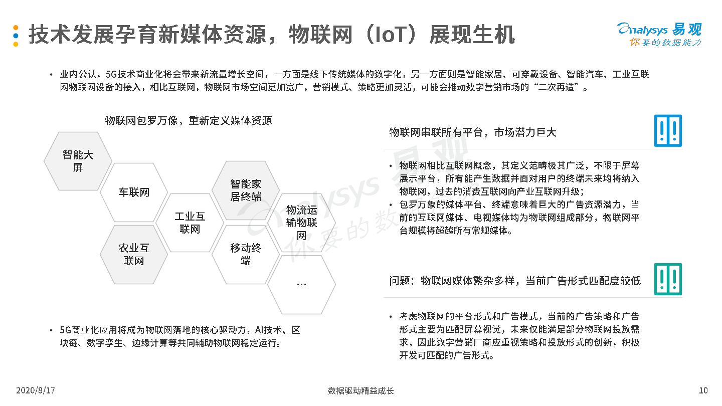 2020年8月17日,易观发布了《中国互联网广告市场年报2020》的分析报告。2019年受宏观经济低迷和互联网用户增长放缓影响,中国互联网广告市场整体发展环境趋于恶化,厂商间竞争激烈,但市场在危机中蕴含生机,B站、知乎等新兴流量平台开始破圈,吸引广告主注意力和预算倾斜;2020年整体市场受新冠疫情影响严重,未来疫情与生产、生活长期共存局面渐成共识,厂商需要积极开拓新兴媒体资源,创新营销模式,谋求长远发展。