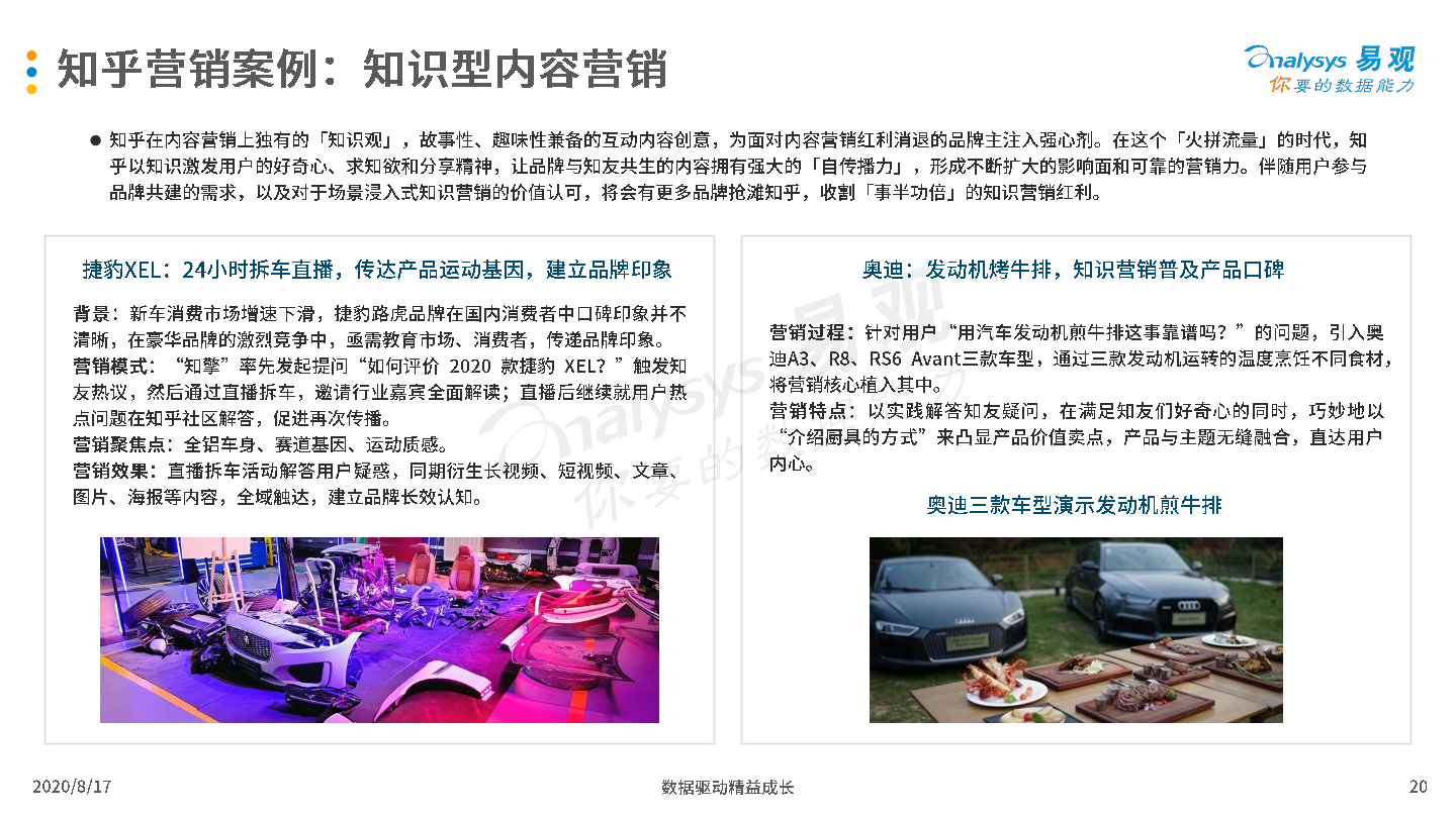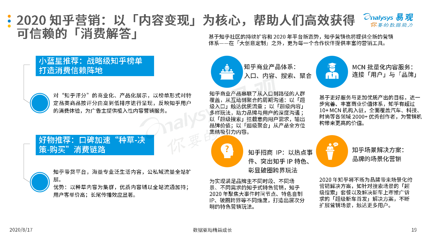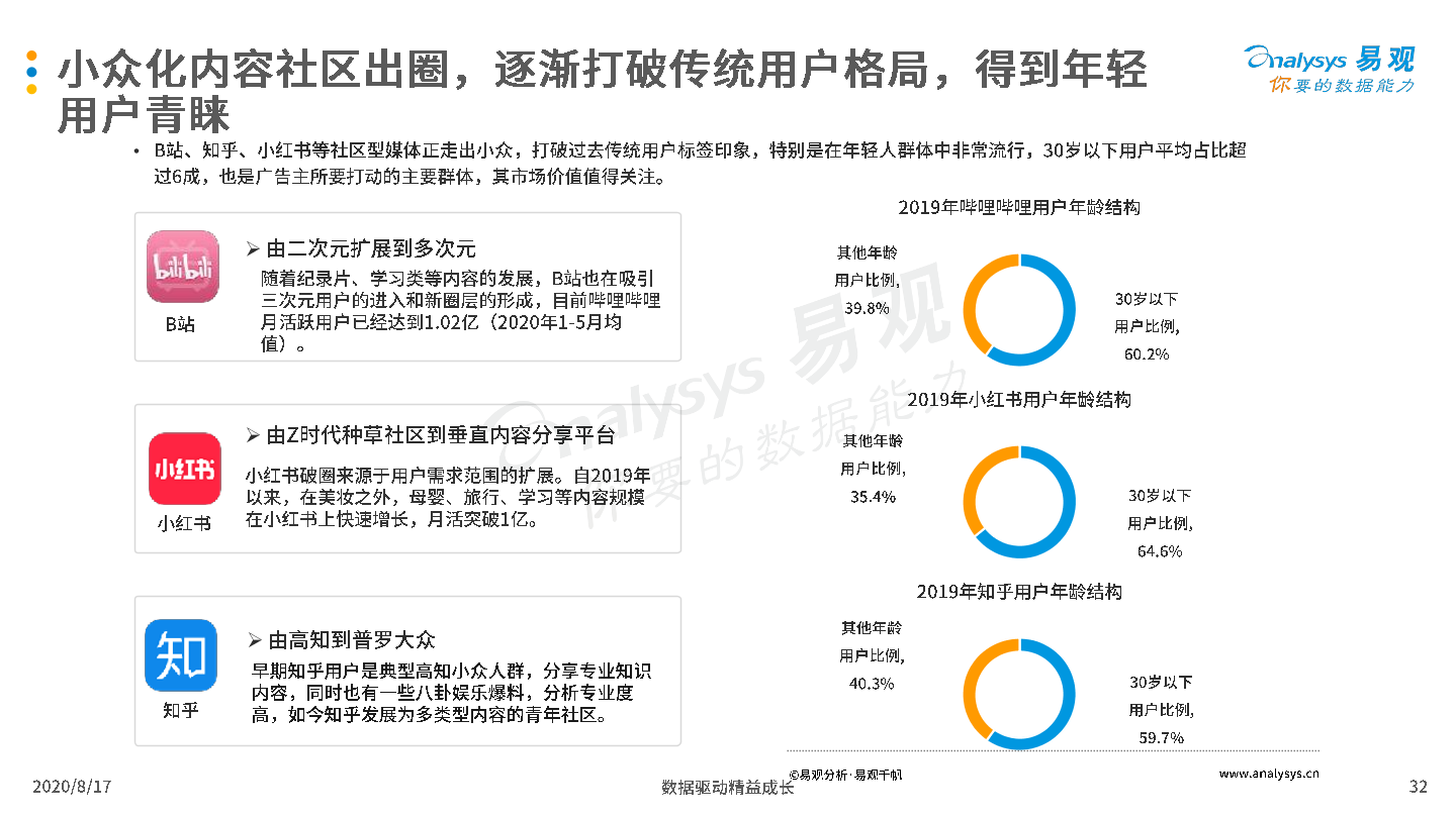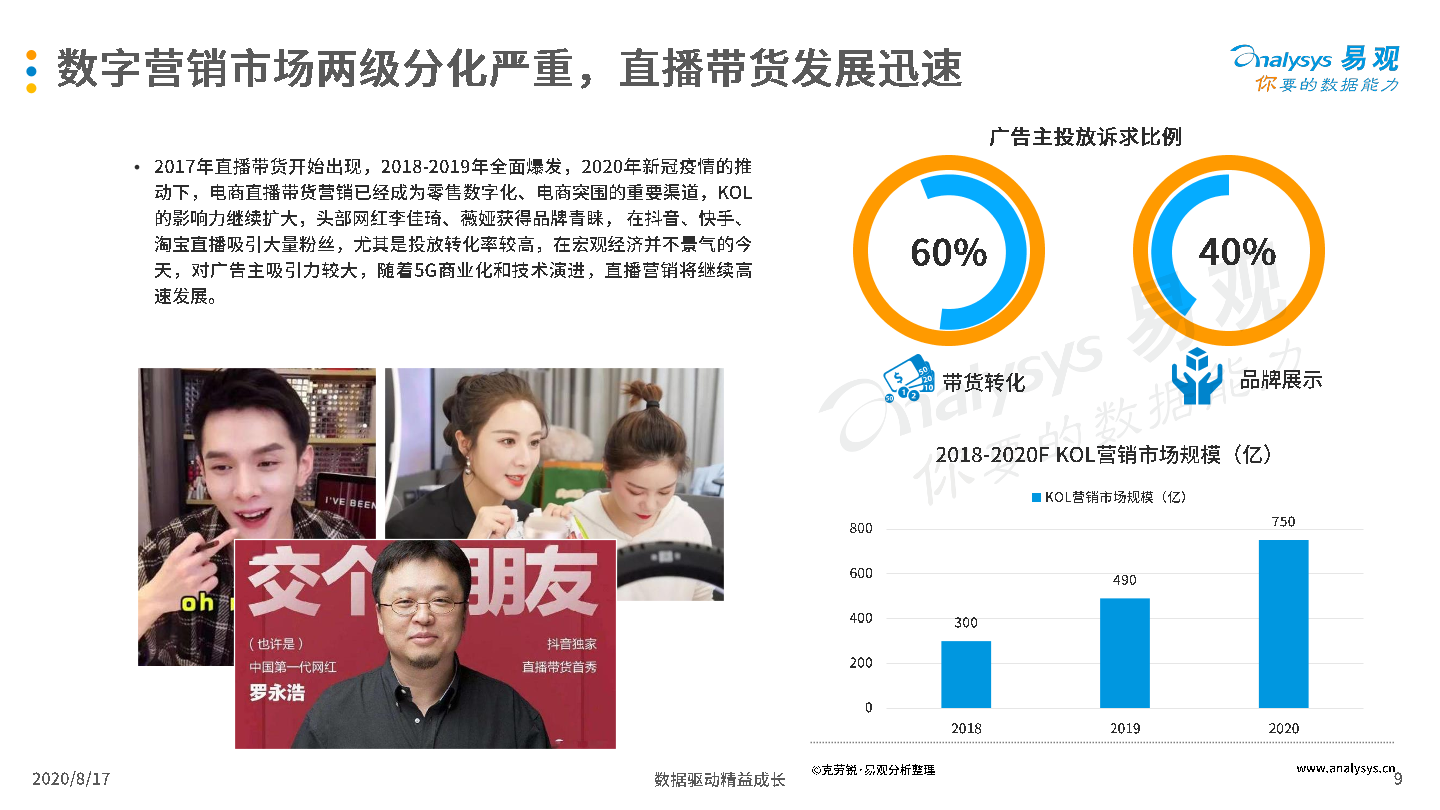 2020年8月17日,易观发布了《中国互联网广告市场年报2020》的分析报告。2019年受宏观经济低迷和互联网用户增长放缓影响,中国互联网广告市场整体发展环境趋于恶化,厂商间竞争激烈,但市场在危机中蕴含生机,B站、知乎等新兴流量平台开始破圈,吸引广告主注意力和预算倾斜;2020年整体市场受新冠疫情影响严重,未来疫情与生产、生活长期共存局面渐成共识,厂商需要积极开拓新兴媒体资源,创新营销模式,谋求长远发展。