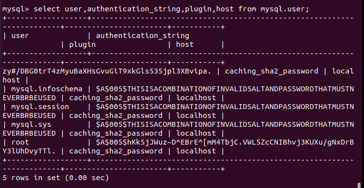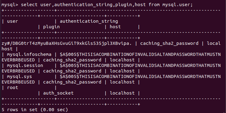 +------------------+------------------------------------------------------------------------+-----------------------+-----------+ | user | authentication_string | plugin | host | +------------------+------------------------------------------------------------------------+-----------------------+-----------+ | debian-sys-maint | $A$005$6&hRoVc['"Ig %y24QdUap.naCDqqph1IImWumU6AWlSLhcwR/NlA7tbn5 | caching_sha2_password | localhost | | mysql.infoschema | $A$005$THISISACOMBINATIONOFINVALIDSALTANDPASSWORDTHATMUSTNEVERBRBEUSED | caching_sha2_password | localhost | | mysql.session | $A$005$THISISACOMBINATIONOFINVALIDSALTANDPASSWORDTHATMUSTNEVERBRBEUSED | caching_sha2_password | localhost | | mysql.sys | $A$005$THISISACOMBINATIONOFINVALIDSALTANDPASSWORDTHATMUSTNEVERBRBEUSED | caching_sha2_password | localhost | | root | | auth_socket | localhost | +------------------+------------------------------------------------------------------------+-----------------------+-----------+ 5 rows in set (0.00 sec)