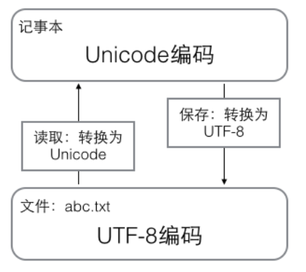 在计算机内存中,统一使用Unicode编码,当需要保存到硬盘或者需要传输的时候,就转换为UTF-8编码。