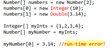 注意:数组是协变的,对于 T[ ] 数组,可以保存类型T及其子类型数据,即使是同一个数组 T[ ],也可存多个不同类型的数据。但当该数组被实例化为其子类型的数组后,就只能存对应子类型元素了: