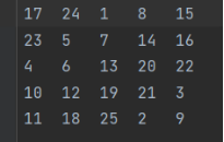 for (int j = 0; j < n; j++) row_sum[0] += array[0][j]; int sum = row_sum[0];//以第一行的和为基准,与其余所求值比较判断 //计算每行的和 for (int i = 1; i < n; i++) { for (int j = 0; j < n; j++) row_sum[i] += array[i][j]; if(row_sum[i] != sum) { System.out.println("error:sums of rows are not equal, " + fileName + " is not a magic square"); return false; } } //计算每列的和 for (int j = 0; j < n; j++){ for (int i = 0; i < n; i++) col_sum[j] += array[i][j]; if(col_sum[j] != sum){ System.out.println("error:sums of columns are not equal to the rows', " + fileName + " is not a magic square"); return false; } } //主对角线和 for (int i = 0; i < n; i++) main_dia += array[i][i]; if(main_dia != sum){ System.out.println("error:sum of main diagonal is not equal to the rows' and columns', " + fileName + " is not a magic square"); return false; } //次对角线和 for (int i = 0; i < n; i++) minor_dia += array[n - 1 - i][i]; if(minor_dia != sum){ System.out.println("error:sum of minor diagonal is not equal to the rows' and columns', " + fileName + " is not a magic square"); return false; }