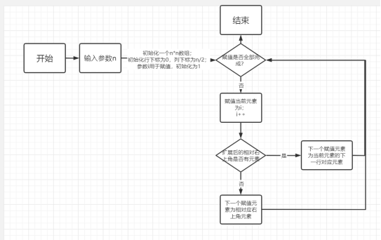 该函数功能是生成一个奇数阶的幻方,具体实现方法已直接给出,实现方式可理解为从第一行中间位置开始,依次为矩阵右上方位置赋值,每次赋值加一。若当前为右边界,则赋值到左边界的相应行;若当前为上边界,则赋值到下边界的相应列;若对应右上元素已经被赋值(每n次赋值就会遇到一次),则赋值到当前元素的相对下一行,并据此继续依次按上述方法赋值,直至完成方阵的全部赋值。由于生成的是奇数阶方阵,需要对原代码稍加补充,判断调用者所给的参数是否为正奇数,补充代码见下: