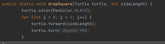 函数drawSquare的实现要求利用forward和turn方法完成一个正方形的绘制。forward方法能够让小海龟在画面上前进给定单位距离,turn方法能够让小海龟右转向90度。
