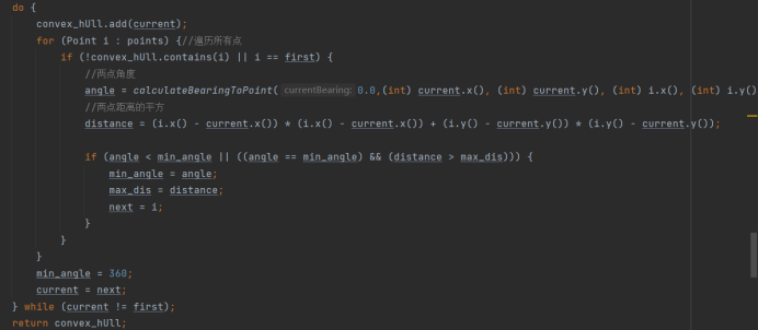 凸包问题,要求计算包住点集所有点的最小点集集合。实现过程中主要利用calculateBearingToPoint函数来计算两点之间的角度。从最右上角的点开始,易知该点一定在所求集合内,从该点开始每次遍历所有点,找到从该点到其余各点中转角最小的点,该点即目标点,将目标点加入集合,此后再以该目标点为基准,继续上述过程,直到再次返回到最开始的点。若在遍历时发现了多个相同最小偏转角度的点,则以距离最远的点作为目标点。主要部分的实现代码见下: