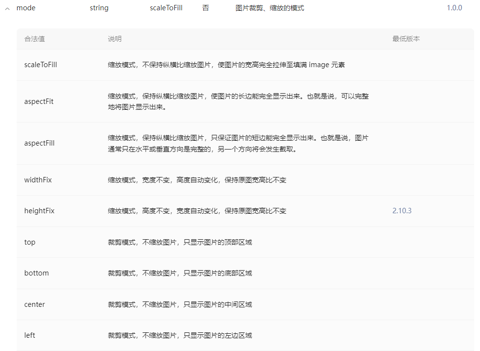 最后,附上小程序 image 标签mode属性,共14种模式,其中缩放模式5个,裁剪模式9个