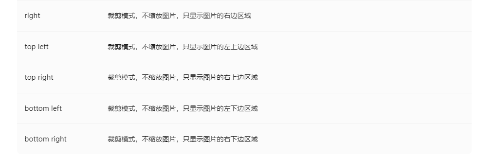 6~14模式、top,bottom,center,left,right,'top left',‘top right’,'bottom left','bottom right':这些模式都是裁剪模式,即原图不缩放,只显示图片的对应区域(裁剪下来的区域)