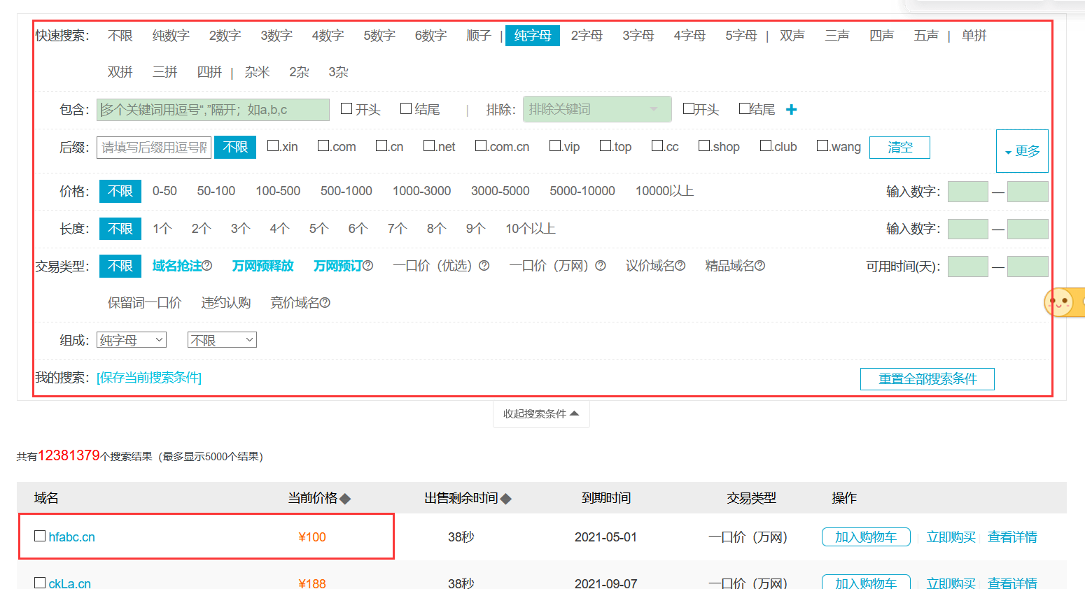 后面就是选中域名,然后购买付钱了。