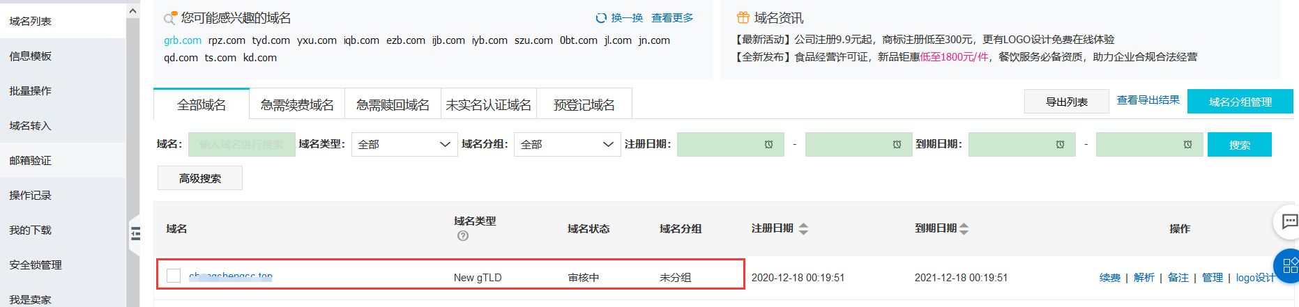 买完之后,进入域名列表,就可以看到购买的域名了