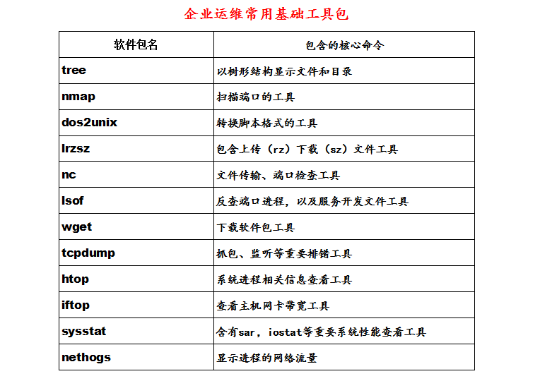 以上工具包的作用及主要包含的命令见表企业运维常用系统工具包: