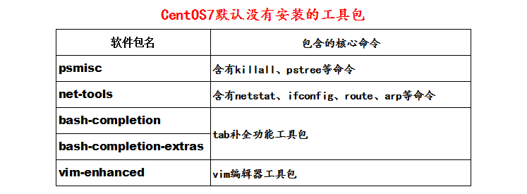 以上工具包是CentOS7默认没有安装一些重要的工具包,见表CentOS7默认没有安装的工具包: