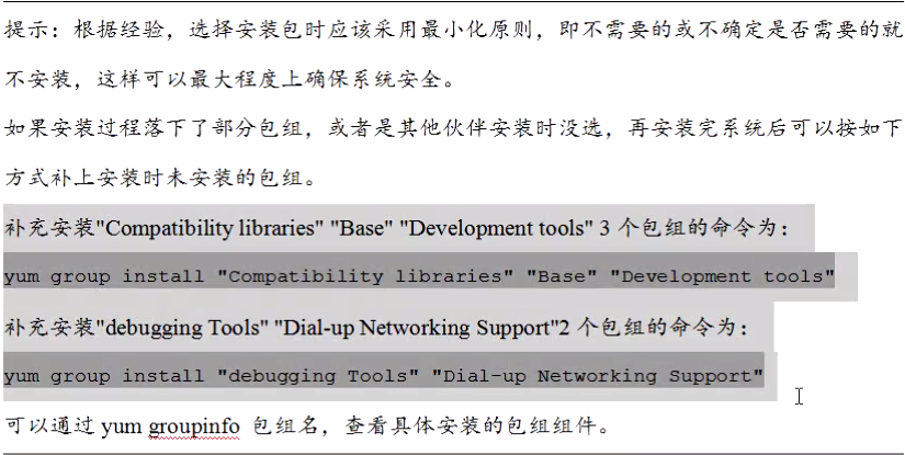 如果在系统安装过程中时落下某些需要的软件包组,可以在这里执行如下命令来安装。
