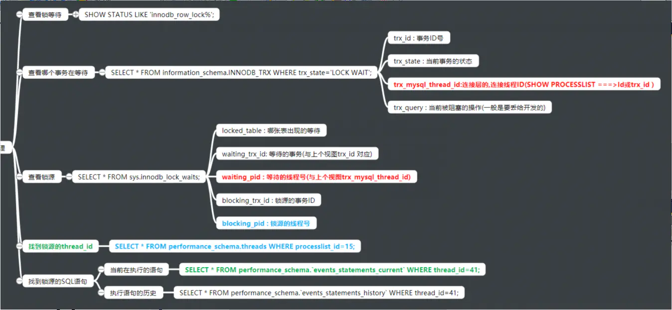 ## 1. 看有没有锁等待 SHOW STATUS LIKE 'innodb_row_lock%'; ## 2. 查看哪个事务在等待(被阻塞了) USE information_schema SELECT * FROM information_schema.INNODB_TRX WHERE trx_state='LOCK WAIT'; trx_id : 事务ID号 trx_state : 当前事务的状态 trx_mysql_thread_id:连接层的,连接线程ID(SHOW PROCESSLIST ===>Id或trx_id ) trx_query : 当前被阻塞的操作(一般是要丢给开发的)